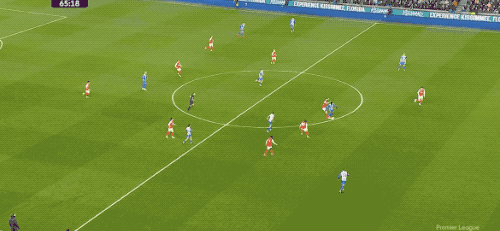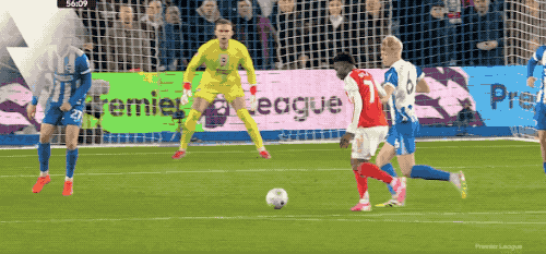 第56分钟,萨卡从中路一直横向盘带,尚未摆脱防守强行起脚射门,皮球打高了。