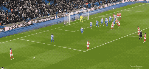 第29分钟,阿森纳获得前场左侧的任意球,赖斯高举左臂,虚晃一枪直接射门,皮球稍稍高出。