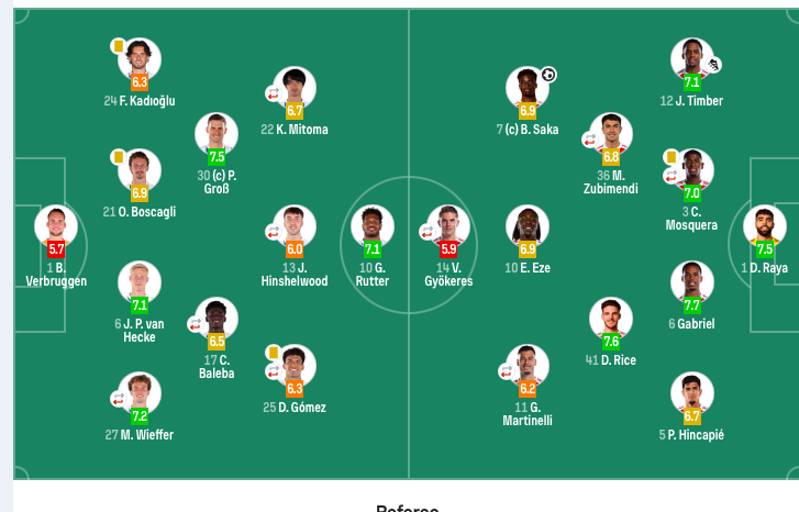 阿森纳首发:1-拉亚、12-廷伯、3-莫斯克拉(64’33-卡拉菲奥里)、6-加布里埃尔、5-因卡皮耶、41-赖斯、36-苏维门迪(80’16-诺尔高)、10-埃泽、7-萨卡、11-马丁内利(59’19-特罗萨德)、14-约克雷斯(59’29-哈弗茨)。